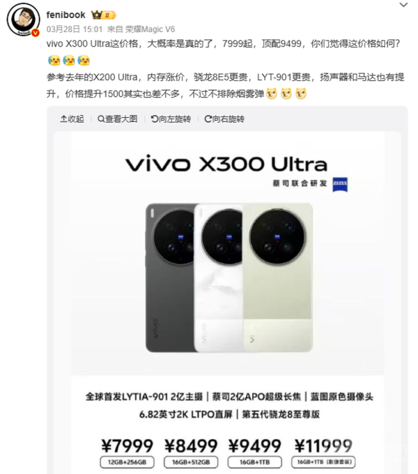 此前,部分博主对vivo X300 Ultra的起售价进行了猜测,普遍认为其起售价为7499元或7999元。其中,推测起售价为7999元的博主表示,内存价格上涨、搭载的第五代骁龙8至尊版移动平台成本提升、索尼LYT-901图像传感器的价格更贵,再加上扬声器与马达的配置升级,使得该机起售价较前代提升1500元具备合理性。具体预测售价为:12GB+256GB版本7999元、16GB+512GB版本8499元、16GB+1TB版本9499元,16GB+1TB版本(影像套装)11999元。